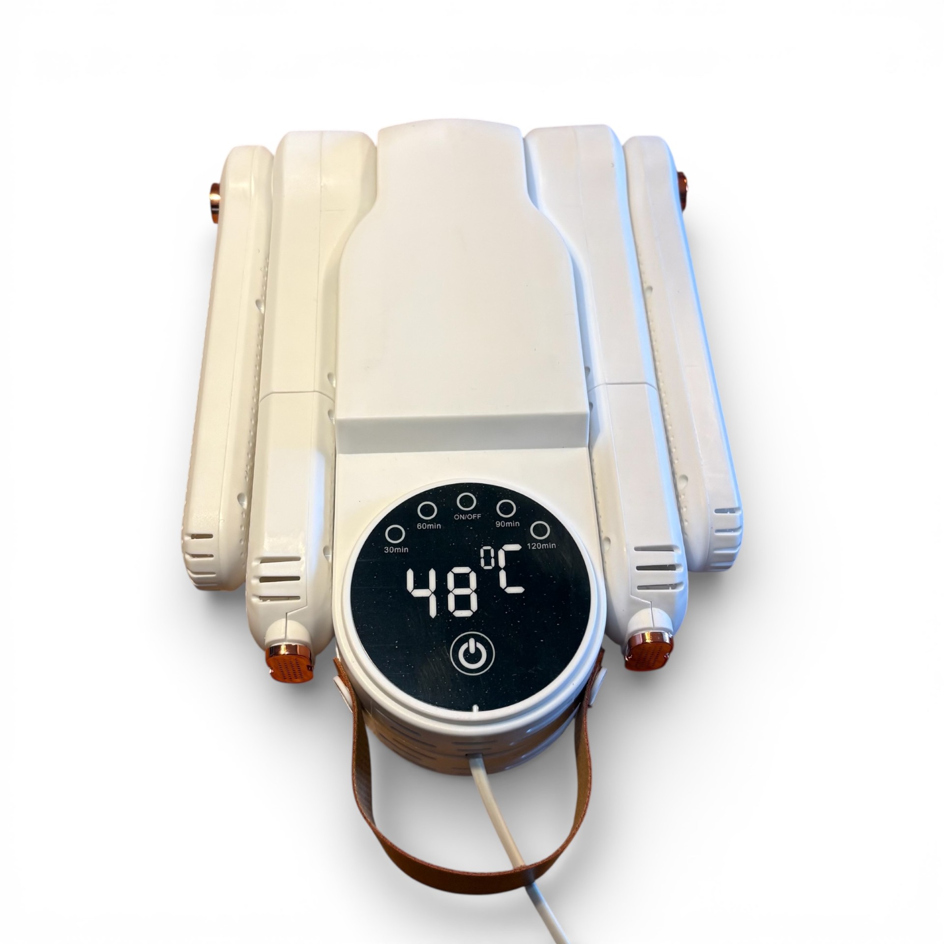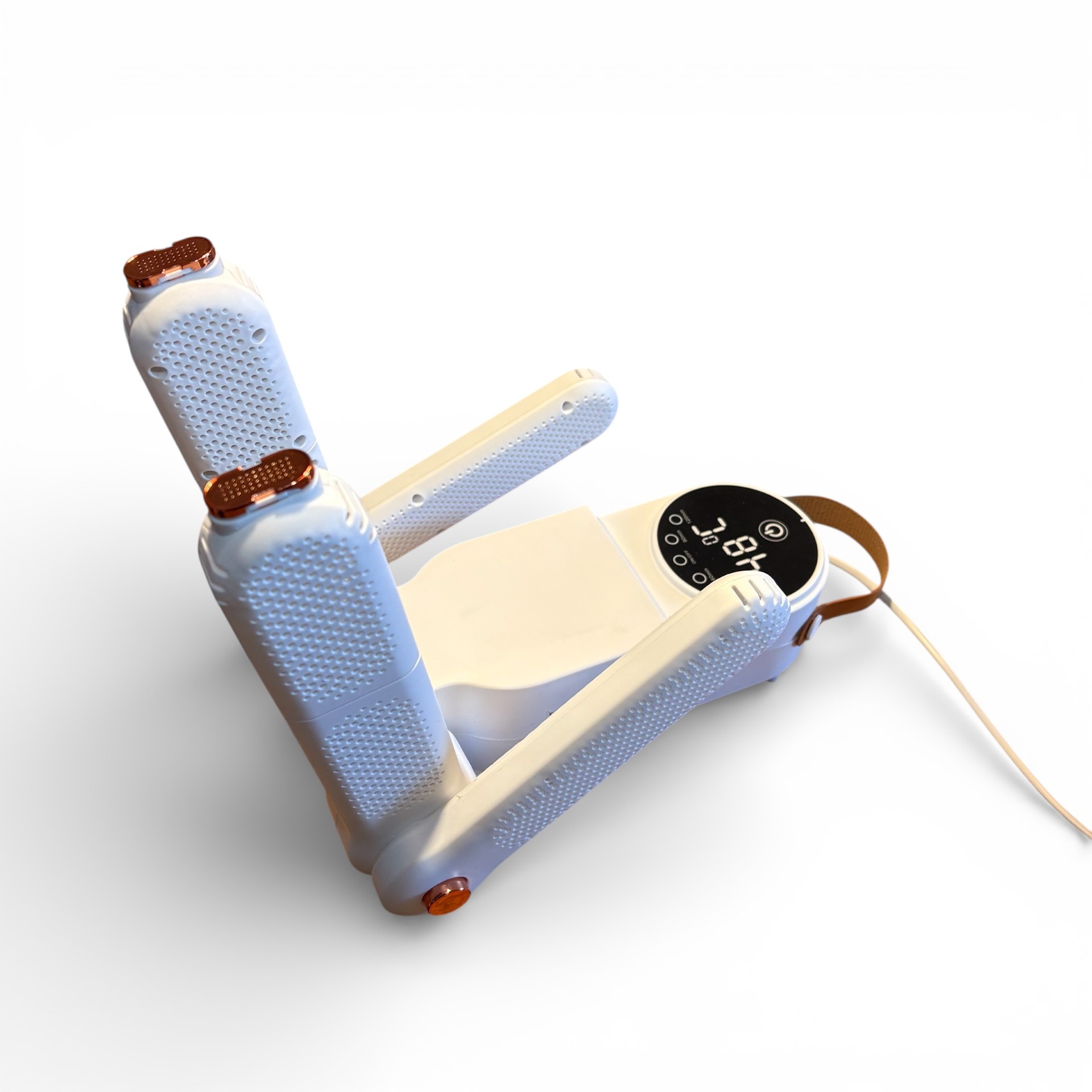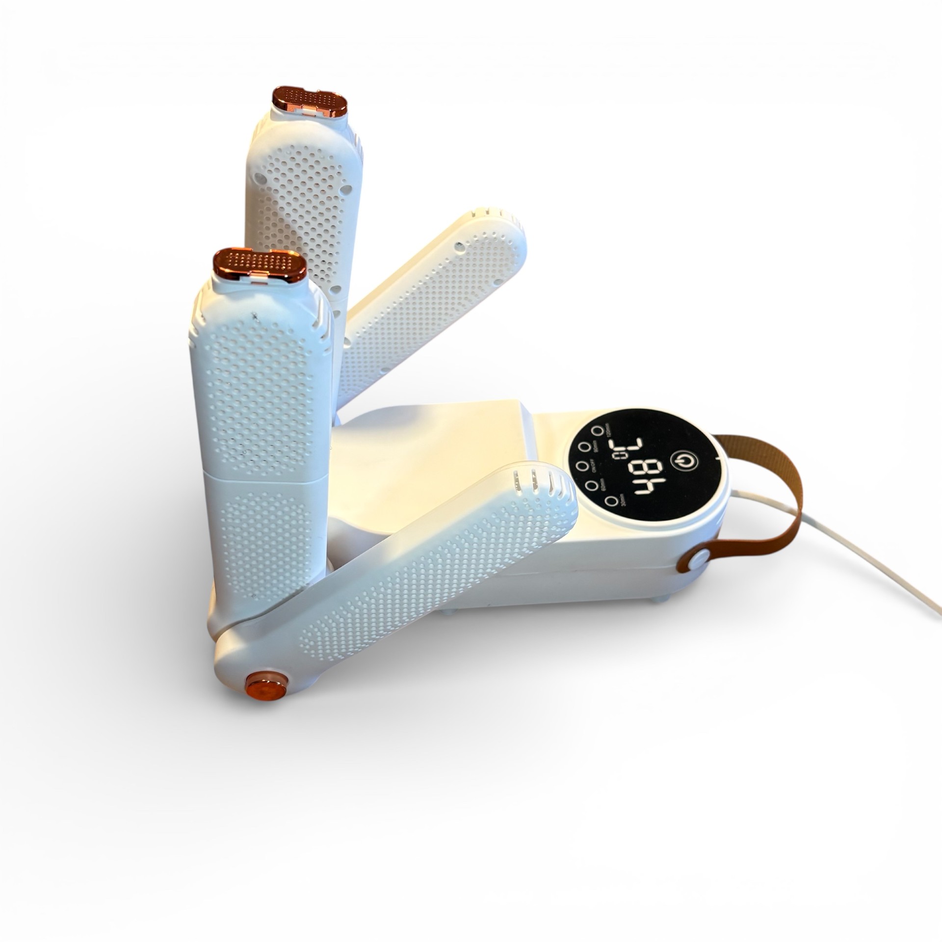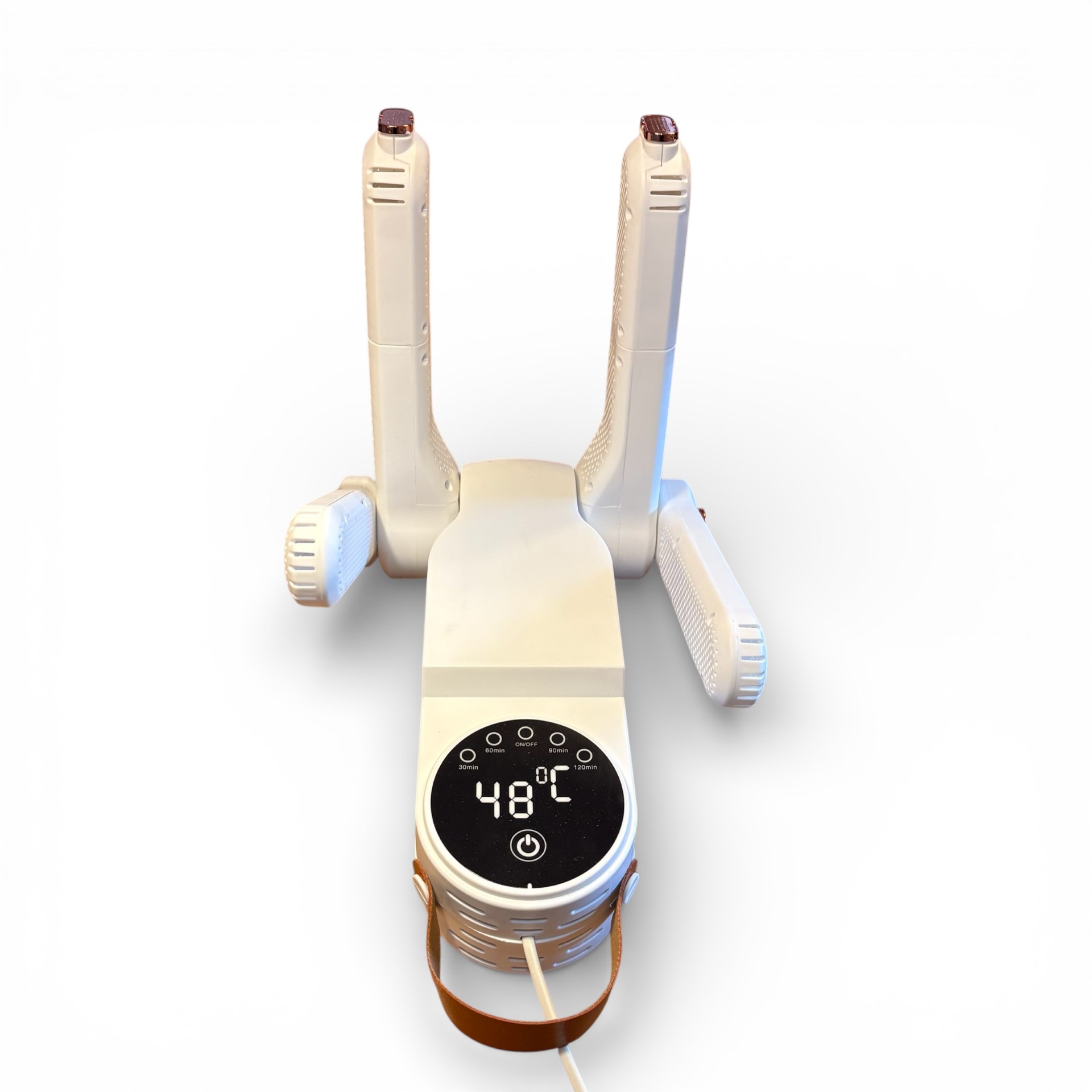 Støvletørreren anvender en jævn og skånsom varme på ca. 48°C, som effektivt fjerner fugt uden at beskadige materialer. Det digitale display og den indbyggede timer på op til 120 minutter gør det nemt at tilpasse tørringen efter behov. Det kompakte design gør den let at placere i entréen, bryggerset eller tage med på rejse.