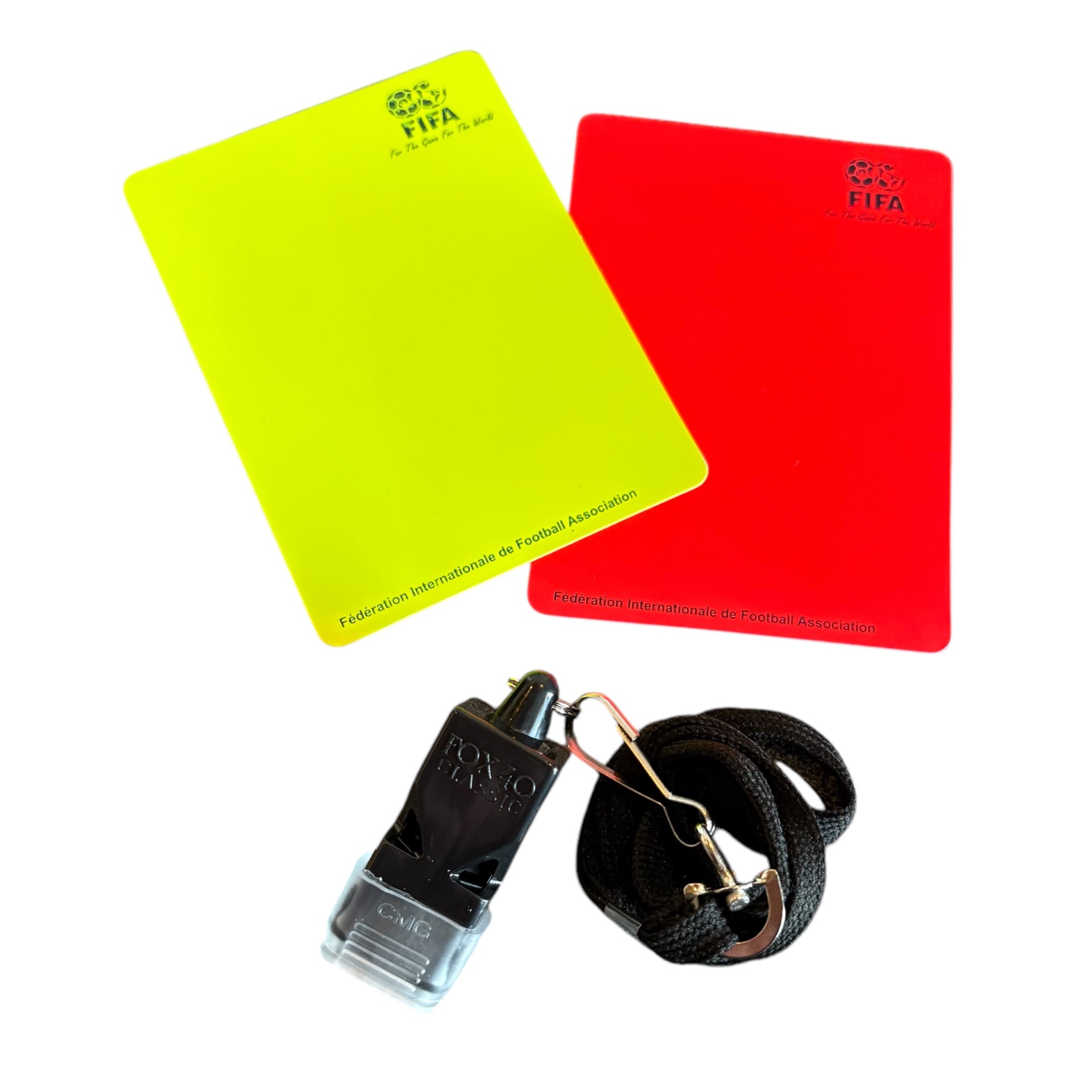 Skal fodboldkampen i haven blive lidt sjovere, så køb dette FIFA dommersæt med gult og orange kort samt sort FOX 40 fløjte med halssnor.