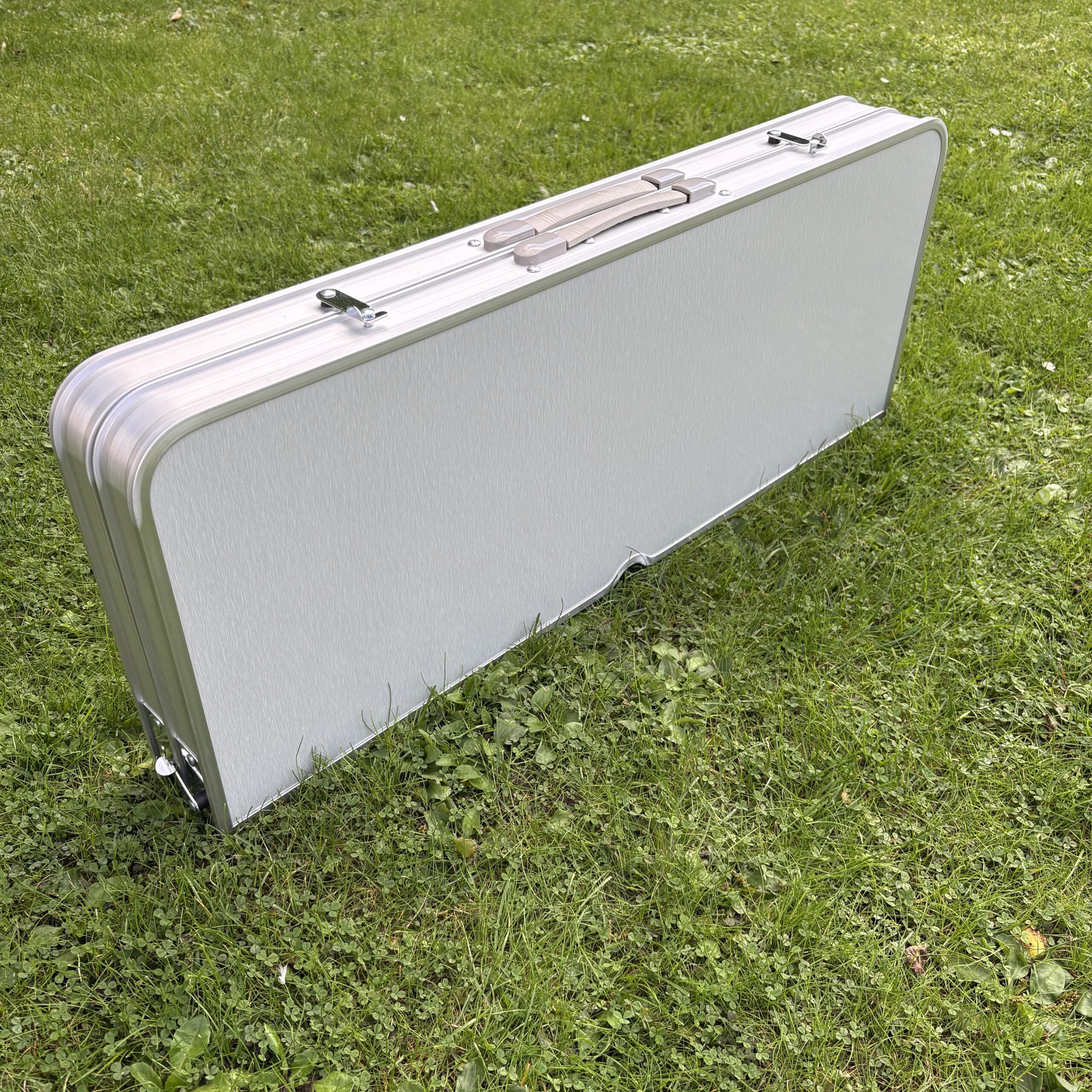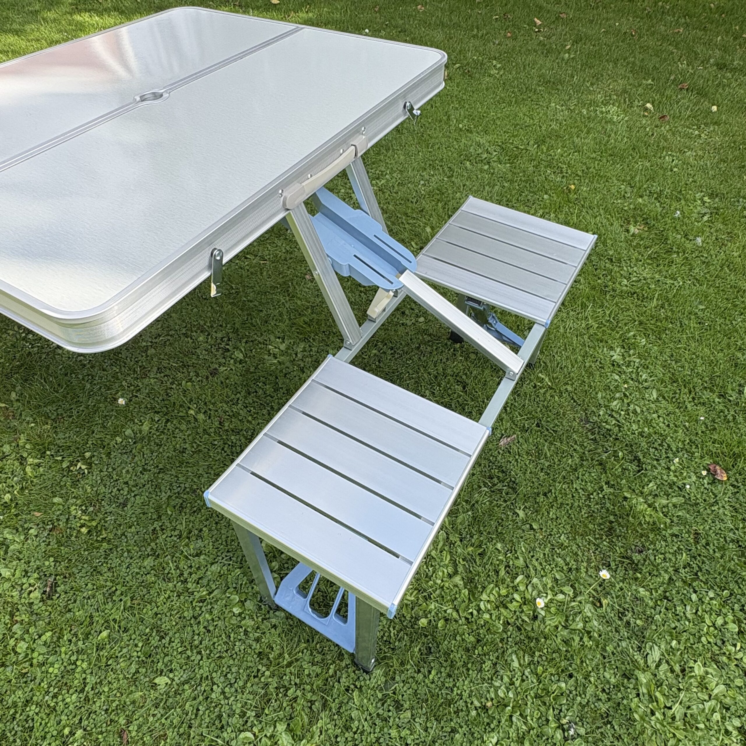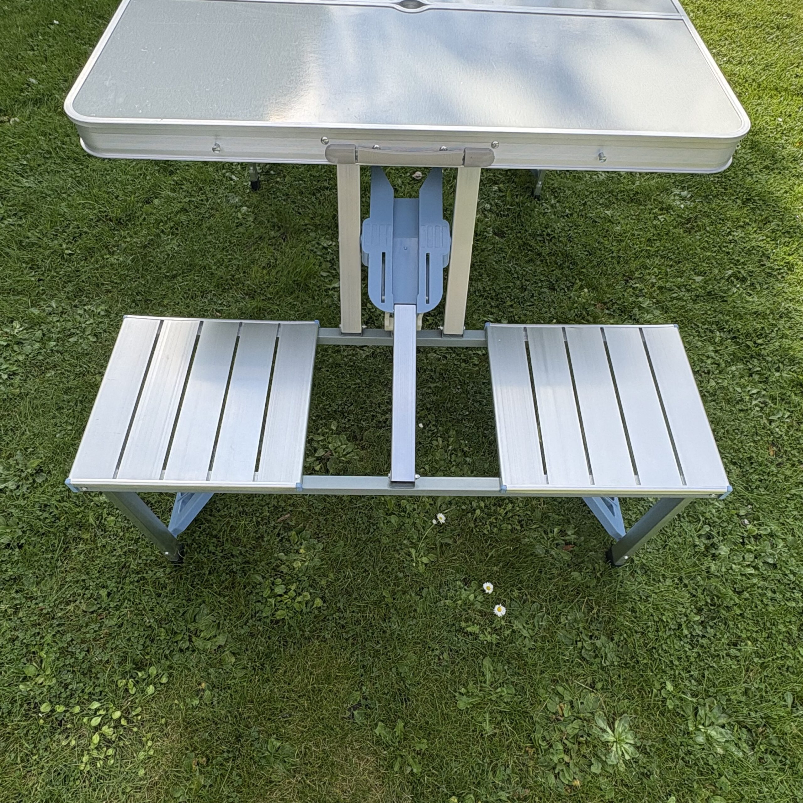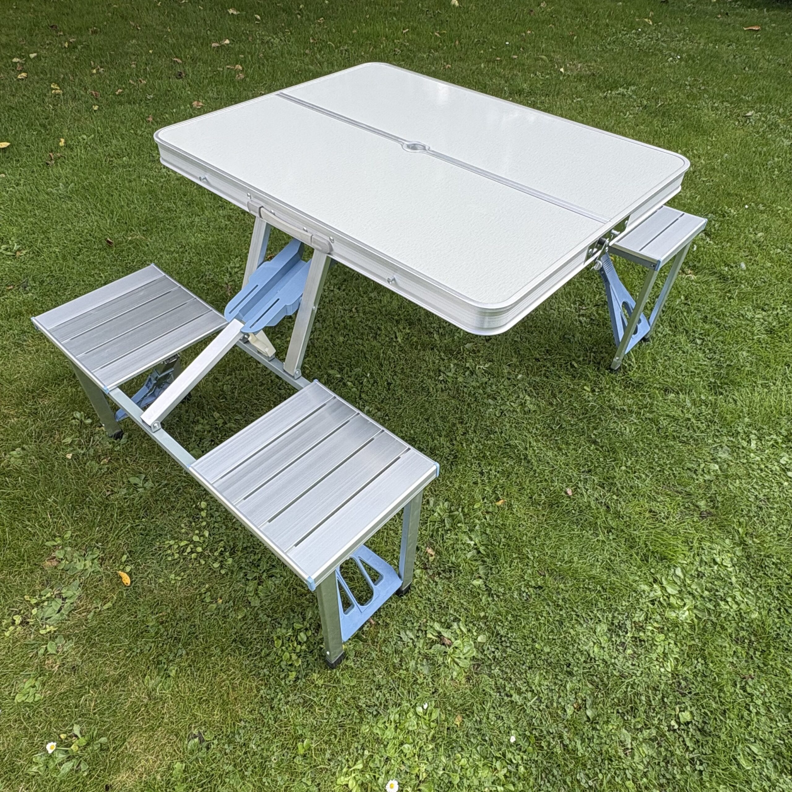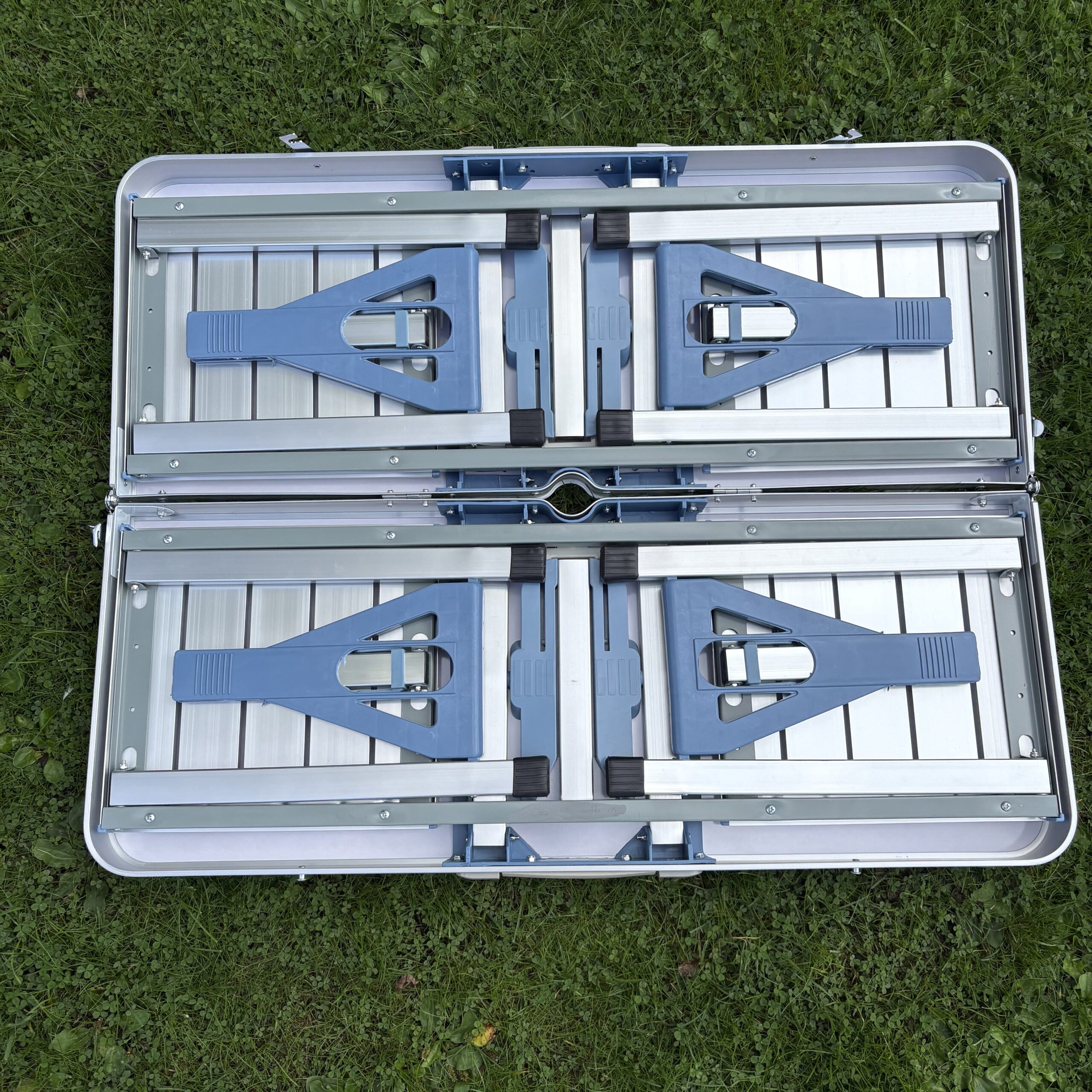 Campingbordet er klar til brug på få sekunder. Kræver ikke brug af værktøj. Det gør det nemt at slå sig ned uanset om du er på farten eller hjemme i haven eller på sportspladsen.