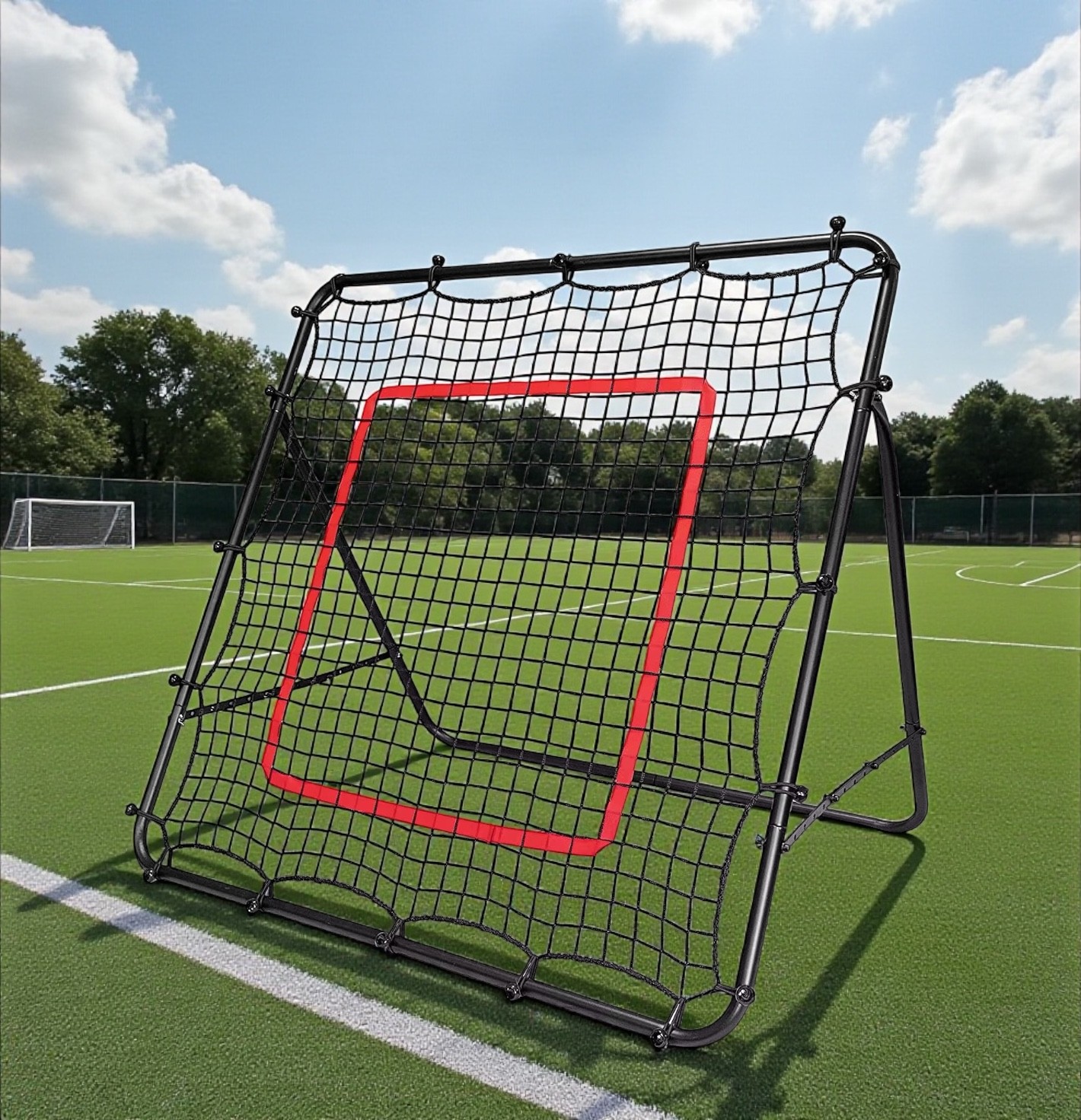 Tag din fodboldtræning til næste niveau med denne alsidige fodbold rebounder fra Freeplay Sport. Med en ramme på 28 mm sorte stålrør og et net i god kvalitet, får du et træningsredskab, der holder til timevis af fodboldspil samt træning hjemme i haven – uanset om du er nybegynder eller øvet.