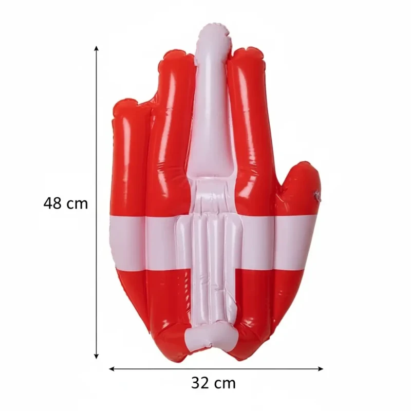 Giv landsholdet en håndsrækning med en oppustelig stor hånd. Så kan hele tribunen nemmere se, hvem du hepper på, når du vifter og vinker med armene. Hånden fungerer som en handske. Du kan med andre ord gøre din hånd til en kæmpe Roligan-hånd, når du skal ud og heppe på de danske spillere. En kæmpe hånd er dog besværlig at slæbe rundt på. Derfor er hånden heldigvis oppustelig og nem at haven med på tur. Så kan du nemt lukke luften ud af den og pakke den sammen til en overskuelig størrelse, når du skal hjemad igen.